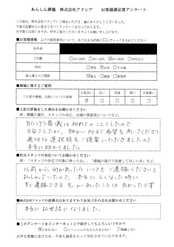 自ら行う葬儀は初めてのことでしたので不安でしたが、細かい所まで希望を聞いてくださり、適切な選択肢をご提案いただきましたので本当に助かりました。
